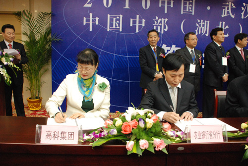 10月29日,2010中國(guó)?武漢金融博覽會(huì)暨中國(guó)中部(湖北)創(chuàng)業(yè)投資大會(huì)簽約儀式舉行。范蘊(yùn)玉總經(jīng)理代表武漢高科集團(tuán)與農(nóng)業(yè)銀行湖北省分行簽訂了授信20億元協(xié)議。