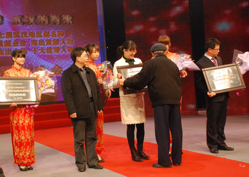 12月12日晚,第七屆武漢地區(qū)創(chuàng)名牌突出貢獻企業(yè)頒獎晚會在武漢電視臺舉行,武漢高科獲“第七屆(2009年度)武漢地區(qū)創(chuàng)名牌突出貢獻企業(yè)”稱號,范蘊玉總經(jīng)理代表集團公司上臺領(lǐng)獎。