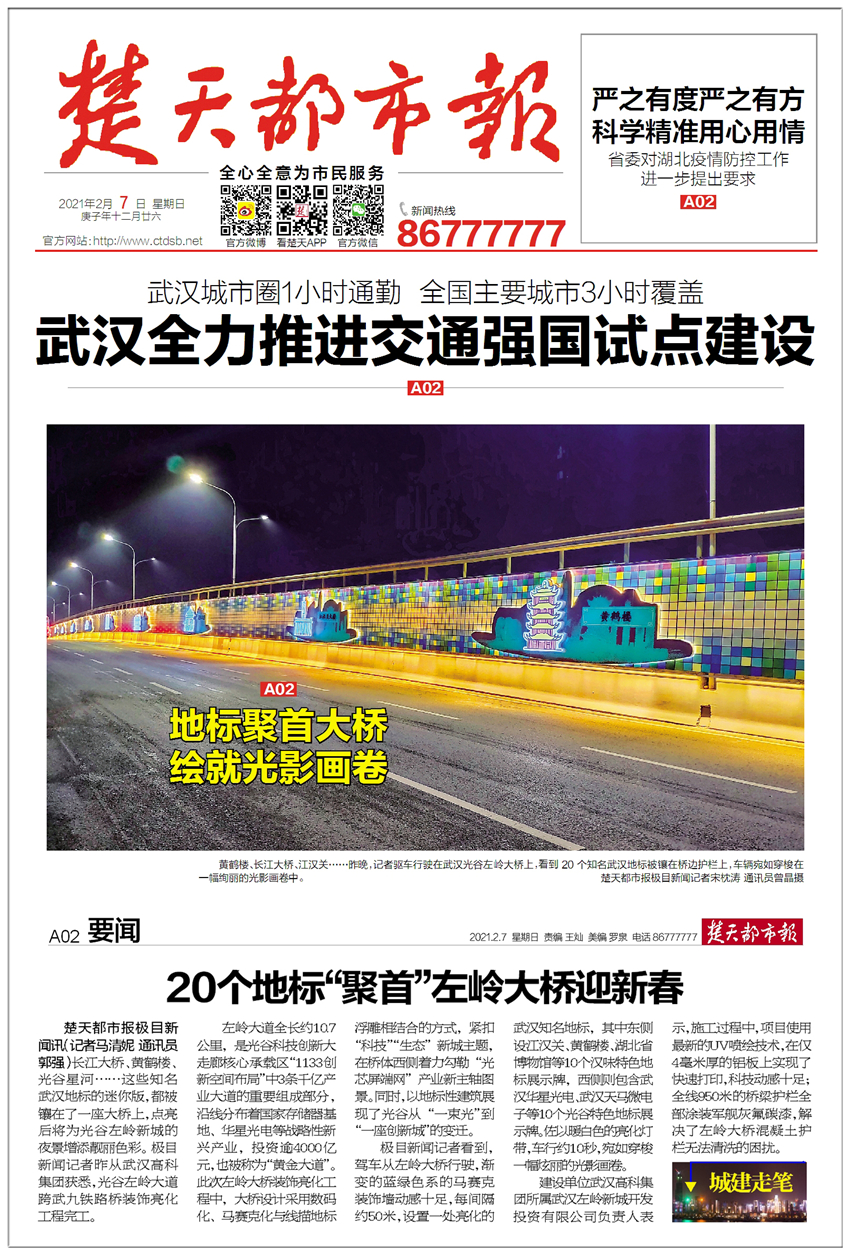 黃鶴樓、長江大橋、江漢關(guān)……昨晚,記者驅(qū)車行駛在武漢光谷左嶺大橋上,看到20個知名武漢地標被鑲在橋邊護欄上,車輛宛如穿梭在一幅絢麗的光影畫卷中。 楚天都市報極目新聞記者宋枕濤 通訊員曾晶攝