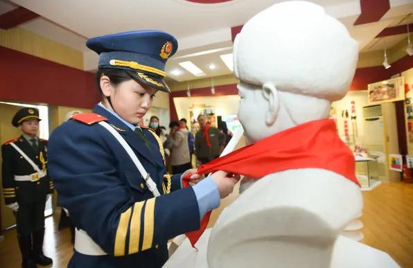 大興路小學(xué)學(xué)生為雷鋒像戴上紅領(lǐng)巾。記者 許魏巍 攝