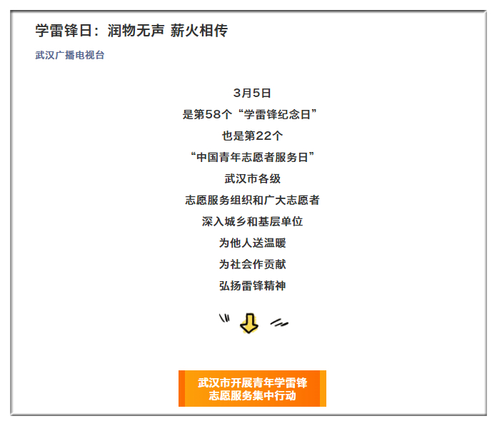 武漢廣播電視臺(tái):學(xué)雷鋒日 潤物無聲 薪火相傳