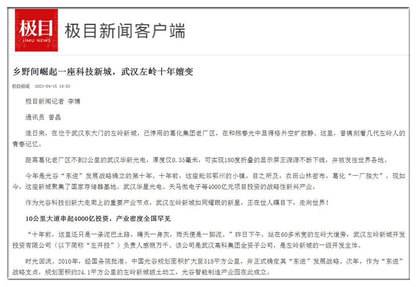 今年是光谷“東進”發(fā)展戰(zhàn)略確立的第十年。十年前,這座毗鄰鄂州的小鎮(zhèn),目之所及,農(nóng)田山林密布,葛化“一廠獨大”?,F(xiàn)如今,這座新城聚集了國家存儲器基地、武漢華星光電、天馬微電子等4000億元項目投資的戰(zhàn)略性新興產(chǎn)業(yè)。