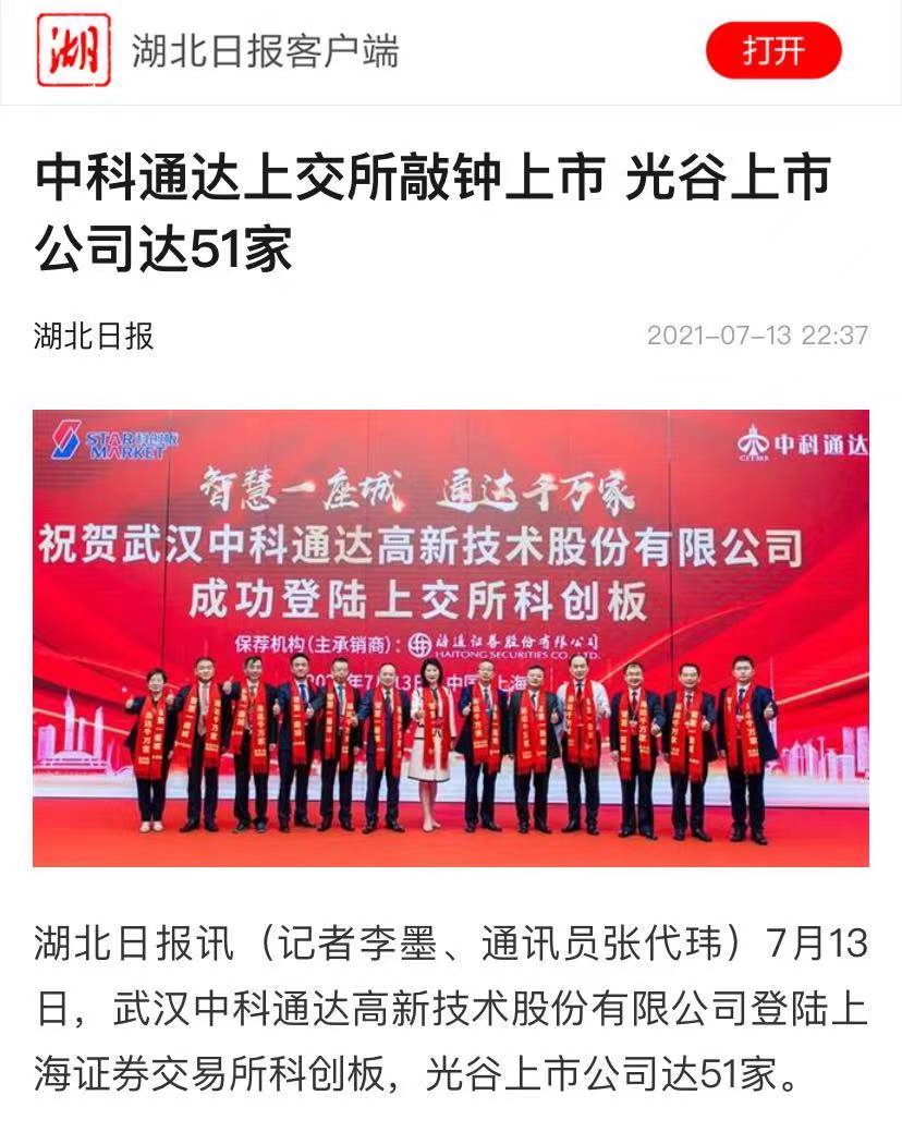 (記者李墨、通訊員張代瑋)7月13日,武漢中科通達(dá)高新技術(shù)股份有限公司登陸上海證券交易所科創(chuàng)板,光谷上市公司達(dá)51家。