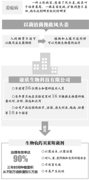 恩施州來鳳縣地標(biāo)產(chǎn)品鳳頭姜的姜瘟病被治好,種植面積從不到1萬畝逐漸恢復(fù)到5萬畝;大興安嶺的樹林里,松樹被噴上蘇云金桿菌,再也不用擔(dān)心松毛蟲……農(nóng)業(yè)土壤的改良,污染水體的治理,作物病蟲害的防治,這一個(gè)個(gè)鮮活的案例,都離不開武漢這家生產(chǎn)生物農(nóng)藥、功能菌、生物特肥的公司——康欣生物科技有限公司。它不僅是一家國家級高新技術(shù)企業(yè),也是中國生物農(nóng)藥行業(yè)標(biāo)準(zhǔn)的主要制定者,是國家生物農(nóng)藥工程技術(shù)研究中心唯一共建單位。