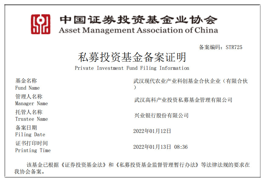 1月12日,武漢現(xiàn)代農(nóng)業(yè)產(chǎn)業(yè)科創(chuàng)基金合伙企業(yè)(有限合伙)經(jīng)中國(guó)證券投資基金業(yè)協(xié)會(huì)審核通過(guò),成功備案,產(chǎn)品編碼為STR725。