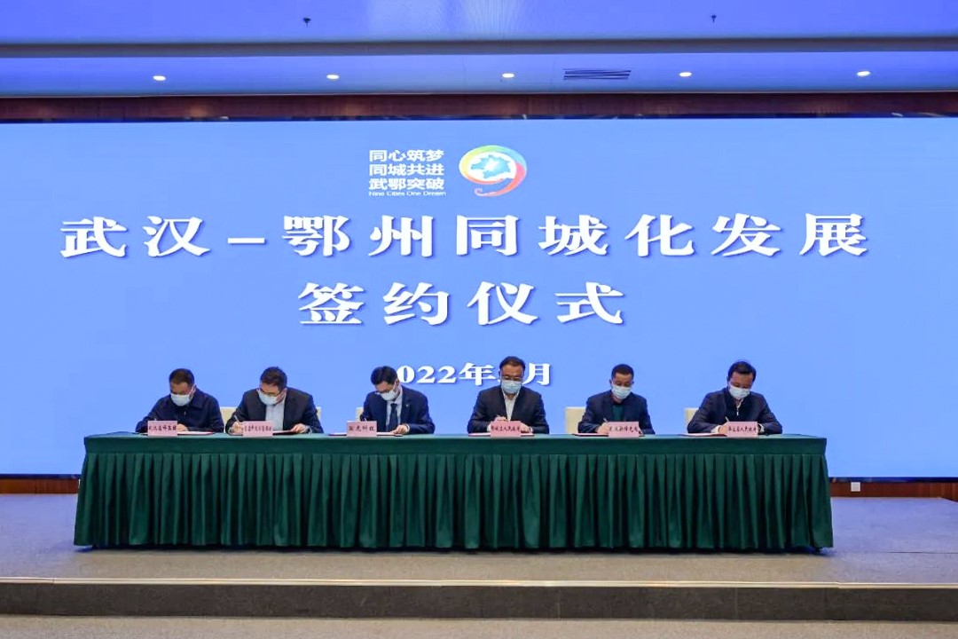 座談會上,程用文、孫兵分別介紹有關(guān)工作情況。雙方簽訂了《武漢鄂州共建武漢城市圈同城化核心區(qū)合作協(xié)議》等文件。其中,武漢高科集團(tuán)與葛店開發(fā)區(qū)管委會簽訂了《光谷葛店毗連區(qū)城市客廳項目合作協(xié)議書》。