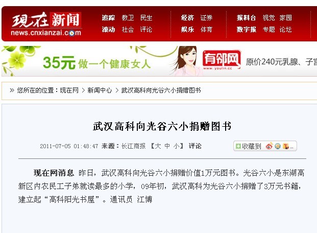 昨日,武漢高科向光谷六小捐贈價值1萬元圖書。光谷六小是東湖高新區(qū)內(nèi)農(nóng)民工子弟就讀最多的小學(xué),09年初,武漢高科為光谷六小捐贈了3萬元書籍,建立起“高科陽光書屋”。通訊員 江博