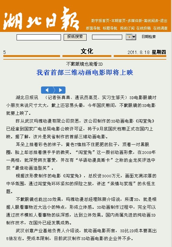 武漢創(chuàng)意產(chǎn)業(yè)基地負(fù)責(zé)人介紹說,就動畫電影而言,3D比2D成本要高出5倍左右。受成本限制,目前武漢制作3D動畫電影的企業(yè)并不多。