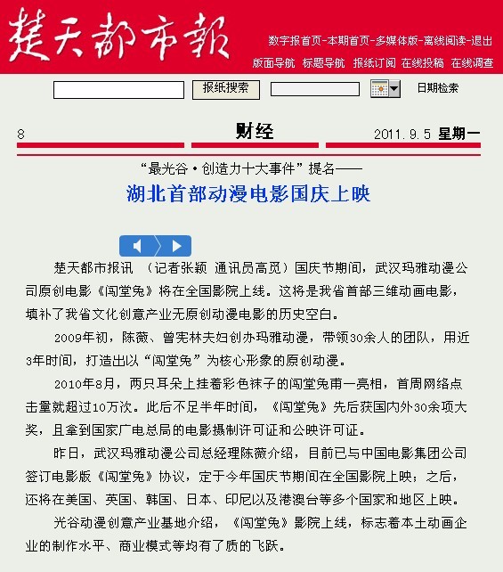 昨日,武漢瑪雅動漫公司總經(jīng)理陳薇介紹,目前已與中國電影集團公司簽訂電影版《闖堂兔》協(xié)議,定于今年國慶節(jié)期間在全國影院上映;之后,還將在美國、英國、韓國、日本、印尼以及港澳臺等多個國家和地區(qū)上映。