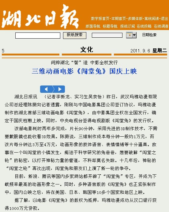 湖北日報訊??(記者李新龍、實習(xí)生吳京怡)昨日,武漢瑪雅動漫有限公司總經(jīng)理陳薇向記者透露,剛剛與中國電影集團公司簽訂協(xié)議,瑪雅動漫制作的湖北首部三維動畫電影《闖堂兔》,由中影集團全權(quán)在全國發(fā)行,確定于國慶檔期上映。同時,中央電視臺簽得電視劇版《闖堂兔》的發(fā)行權(quán)。