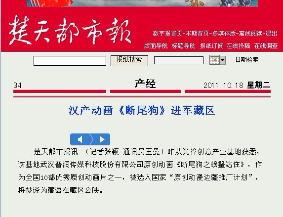 楚天都市報(bào)訊?(記者張穎?通訊員王曼)昨從光谷創(chuàng)意產(chǎn)業(yè)基地獲悉,該基地武漢普潤(rùn)傳媒科技股份有限公司原創(chuàng)動(dòng)畫《斷尾狗之螃蟹站住》,作為全國(guó)10部?jī)?yōu)秀原創(chuàng)動(dòng)畫片之一,被選入國(guó)家“原創(chuàng)動(dòng)漫邊疆推廣計(jì)劃”,將被譯為藏語(yǔ)在藏區(qū)公映。