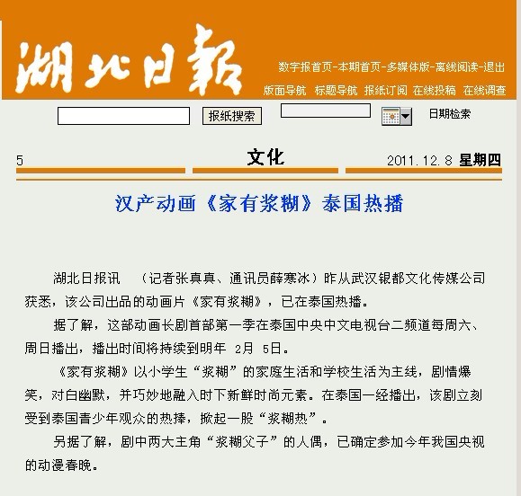 湖北日報訊 (記者張真真、通訊員薛寒冰)昨從武漢銀都文化傳媒公司獲悉,該公司出品的動畫片《家有漿糊》,已在泰國熱播。