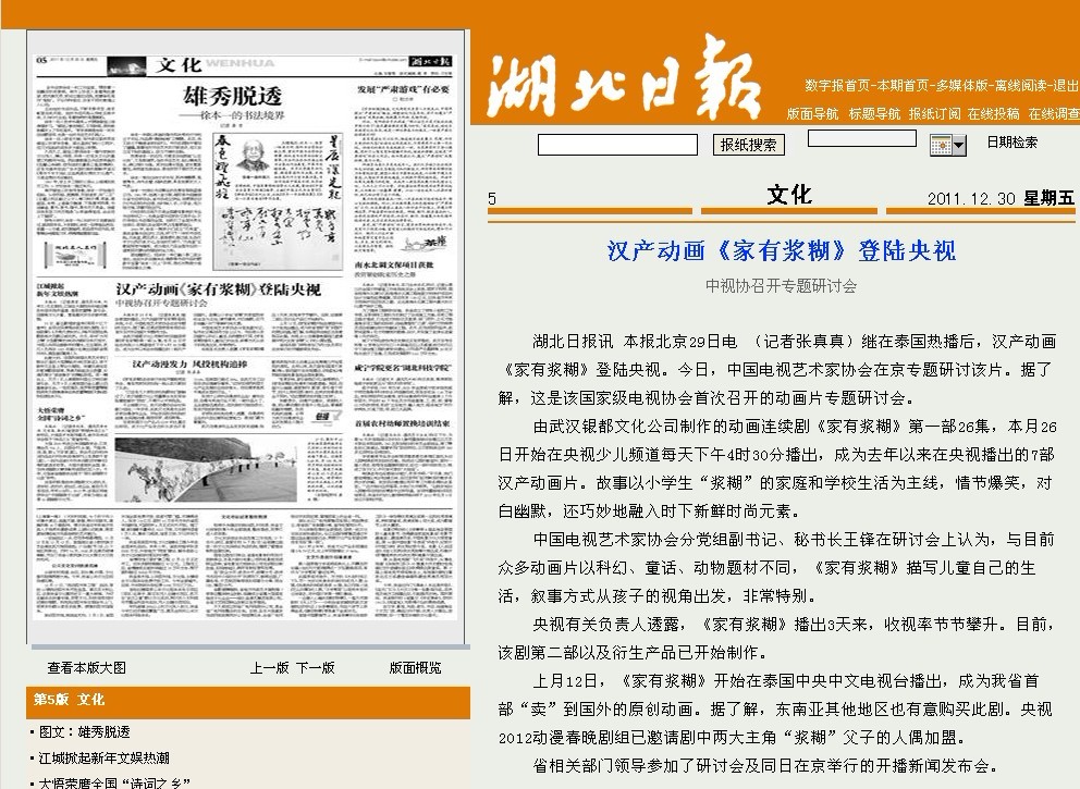 上月12日,《家有漿糊》開始在泰國中央中文電視臺(tái)播出,成為我省首部“賣”到國外的原創(chuàng)動(dòng)畫。據(jù)了解,東南亞其他地區(qū)也有意購買此劇。央視2012動(dòng)漫春晚劇組已邀請劇中兩大主角“漿糊”父子的人偶加盟。