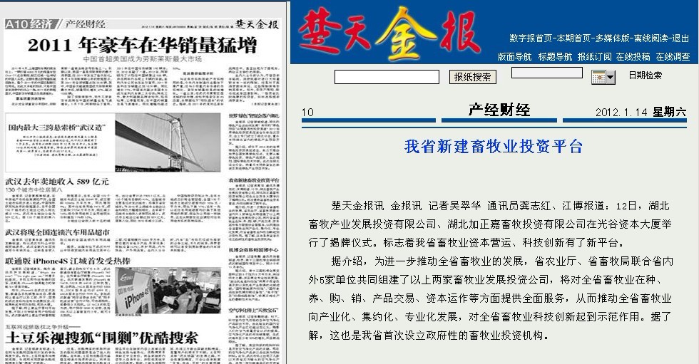 楚天金報(bào)訊?金報(bào)訊?記者吳翠華?通訊員龔志紅、江博報(bào)道:12日,湖北畜牧產(chǎn)業(yè)發(fā)展投資有限公司、湖北加正嘉畜牧投資有限公司在光谷資本大廈舉行了揭牌儀式。標(biāo)志著我省畜牧業(yè)資本營運(yùn)、科技創(chuàng)新有了新平臺(tái)。