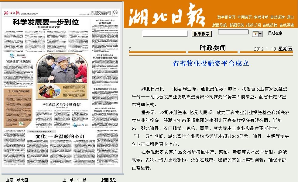 據(jù)介紹,公司注冊資本1億元人民幣,致力于農(nóng)牧業(yè)創(chuàng)業(yè)投資基金和新興農(nóng)牧產(chǎn)業(yè)的投資,并聯(lián)合江西正邦集團(tuán)組建湖北正嘉畜牧投資有限公司。近年來,湖北神丹、漢口精武、思樂、同星、襄大等本土企業(yè)和品牌不斷壯大?!笆晃濉逼陂g,湖北畜牧產(chǎn)業(yè)吸納各類資本超過200億元,神丹、中博等龍頭企業(yè)正在積極謀求上市。