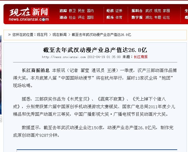 數(shù)據(jù)顯示,截至去年武漢動(dòng)漫企業(yè)達(dá)150家,動(dòng)漫產(chǎn)業(yè)總產(chǎn)值26.8億元,制作完成原創(chuàng)動(dòng)畫片9287分鐘。