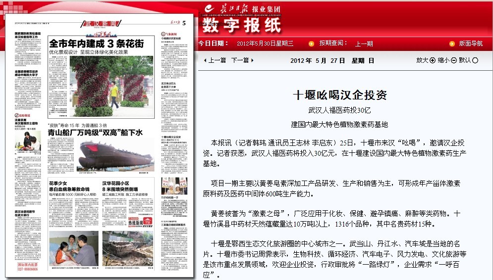 本報(bào)訊(記者韓瑋?通訊員王志林?李啟東)25日,十堰市來(lái)漢“吆喝”,邀請(qǐng)漢企投資。記者獲悉,武漢人福醫(yī)藥將投入30億元,在十堰建設(shè)國(guó)內(nèi)最大特色植物激素藥生產(chǎn)基地。