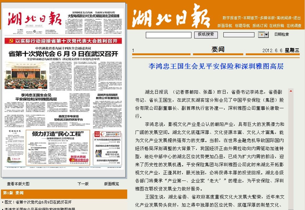 王國生說,湖北省委、省政府高度重視文化大發(fā)展大繁榮,近年來文化產(chǎn)業(yè)發(fā)展勢頭良好,加之得中獨(dú)厚的區(qū)位優(yōu)勢、底蘊(yùn)深厚的荊楚文化、堅(jiān)實(shí)雄厚的工業(yè)基礎(chǔ),能夠?yàn)橹袊桨才c深圳雅圖進(jìn)一步發(fā)展提供充足的要素保障和廣闊的市場空間。希望中國平安與深圳雅圖積極推動(dòng)湖北廣播影視事業(yè)和文化產(chǎn)業(yè)全面發(fā)展,實(shí)現(xiàn)資源共享、優(yōu)勢互補(bǔ)、共同發(fā)展。