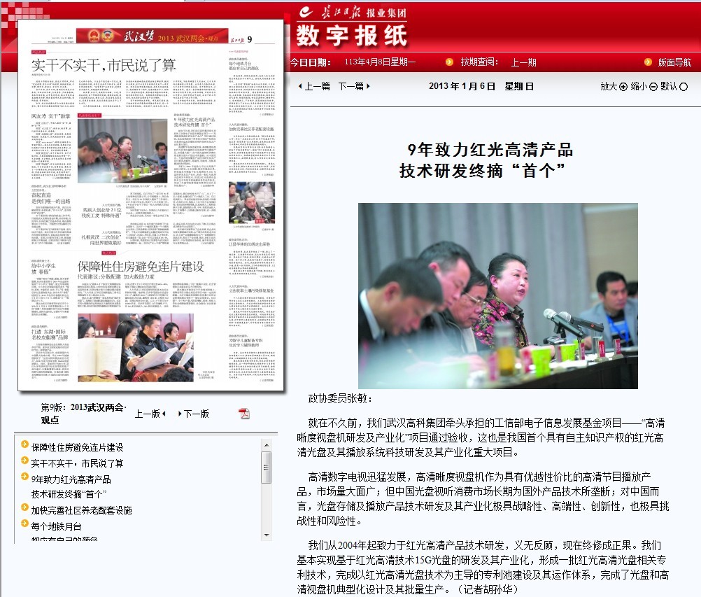 ? ? 就在不久前,我們武漢高科集團(tuán)牽頭承擔(dān)的工信部電子信息發(fā)展基金項(xiàng)目——“高清晰度視盤機(jī)研發(fā)及產(chǎn)業(yè)化”項(xiàng)目通過(guò)驗(yàn)收,這也是我國(guó)首個(gè)具有自主知識(shí)產(chǎn)權(quán)的紅光高清光盤及其播放系統(tǒng)科技研發(fā)及其產(chǎn)業(yè)化重大項(xiàng)目。