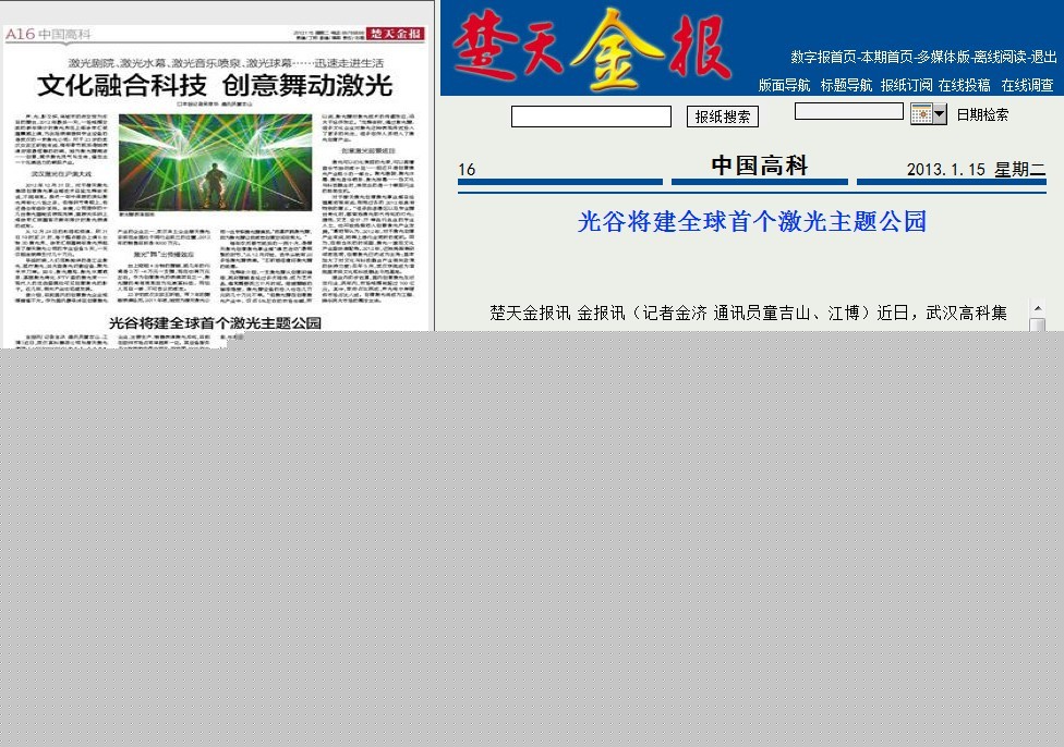 ????此次三方合作中,楚天激光將與LASERWORLD聯(lián)手建立合資公司,武漢高科集團將在左嶺新城為其提供建設用地,共同打造全球首個激光主題公園。