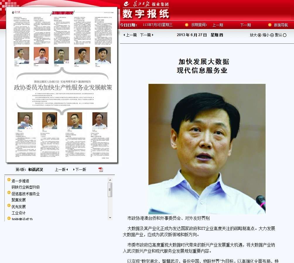 ? ? 市委市政府應(yīng)高度重視大數(shù)據(jù)時(shí)代帶來的新興產(chǎn)業(yè)發(fā)展重大機(jī)遇,將大數(shù)據(jù)產(chǎn)業(yè)納入武漢新興產(chǎn)業(yè)和現(xiàn)代服務(wù)業(yè)發(fā)展規(guī)劃重要內(nèi)容。