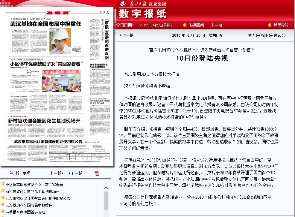 ? ? 本報訊(記者熊琳暉 通訊員杜志剛)戴上3D眼鏡,可在家中電視熒屏上感受三維立體動畫的逼真效果。記者20日從湖北盛泰文化傳媒有限公司獲悉,由該公司歷時兩年制作的3D立體動畫片《福吉小熊貓》將于10月份登陸中央電視臺3D頻道。據(jù)悉,這是我省首次采用3D立體成像技術打造的電視動畫片。