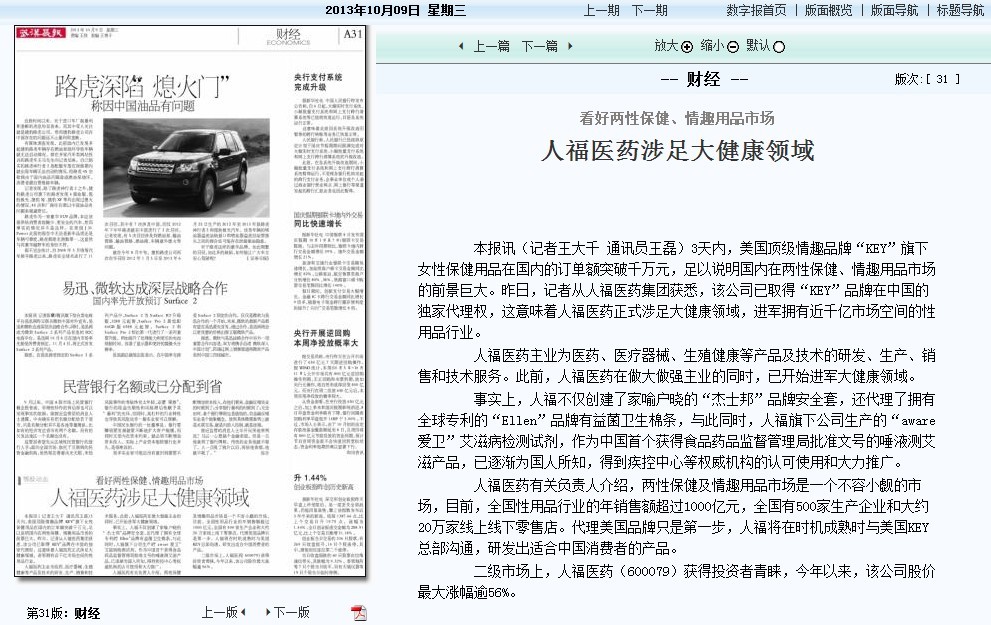 人福醫(yī)藥有關負責人介紹,兩性保健及情趣用品市場是一個不容小覷的市場,目前,全國性用品行業(yè)的年銷售額超過1000億元,全國有500家生產企業(yè)和大約20萬家線上線下零售店。代理美國品牌只是第一步,人福將在時機成熟時與美國KEY總部溝通,研發(fā)出適合中國消費者的產品。