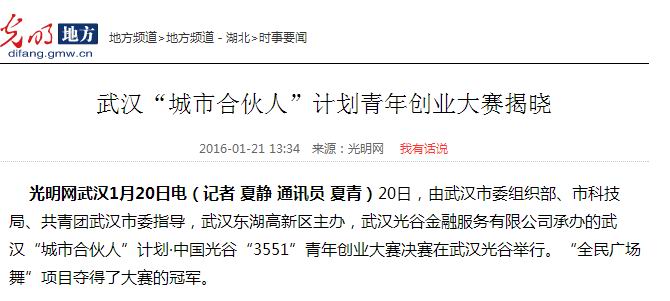 20日,由武漢市委組織部、市科技局、共青團(tuán)武漢市委指導(dǎo),武漢東湖高新區(qū)主辦,武漢光谷金融服務(wù)有限公司承辦的武漢“城市合伙人”計(jì)劃·中國(guó)光谷“3551”青年創(chuàng)業(yè)大賽決賽在武漢光谷舉行?!叭駨V場(chǎng)舞”項(xiàng)目奪得了大賽的冠軍。