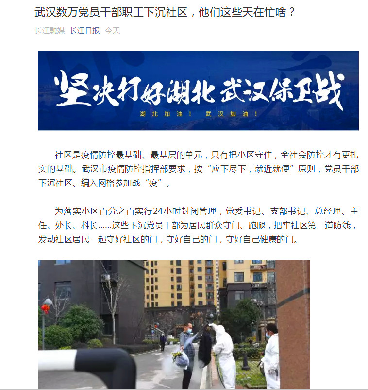 長江日報旗下長江融媒微信公眾號在《武漢數(shù)萬黨員干部職工下沉社區(qū),他們這些天在忙啥?》一文中報道武漢高科集團(tuán)全資企業(yè)武漢東湖企業(yè)管理有限公司總經(jīng)理王蔚謙,下沉在關(guān)東街長山社區(qū)服務(wù),組織發(fā)動社區(qū)40名黨員組成志愿者服務(wù)隊,為居民團(tuán)購生活物資,保障日常生活等有關(guān)事宜。