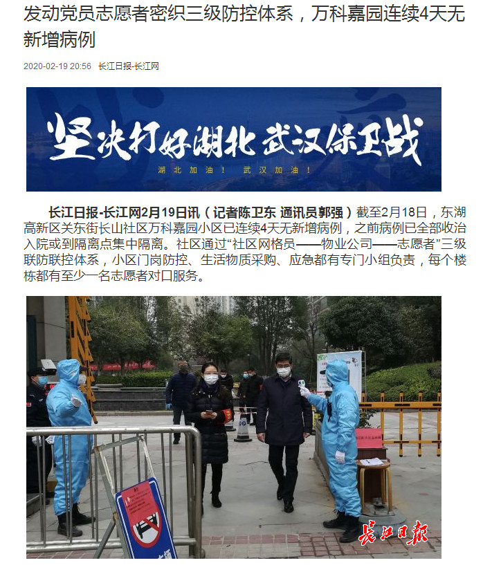 長江日報-長江網(wǎng)2月19日訊(記者陳衛(wèi)東?通訊員郭強)截至2月18日,東湖高新區(qū)關(guān)東街長山社區(qū)萬科嘉園小區(qū)已連續(xù)4天無新增病例,之前病例已全部收治入院或到隔離點集中隔離。社區(qū)通過“社區(qū)網(wǎng)格員——物業(yè)公司——志愿者”三級聯(lián)防聯(lián)控體系,小區(qū)門崗防控、生活物質(zhì)采購、應(yīng)急都有專門小組負責,每個樓棟都有至少一名志愿者對口服務(wù)。