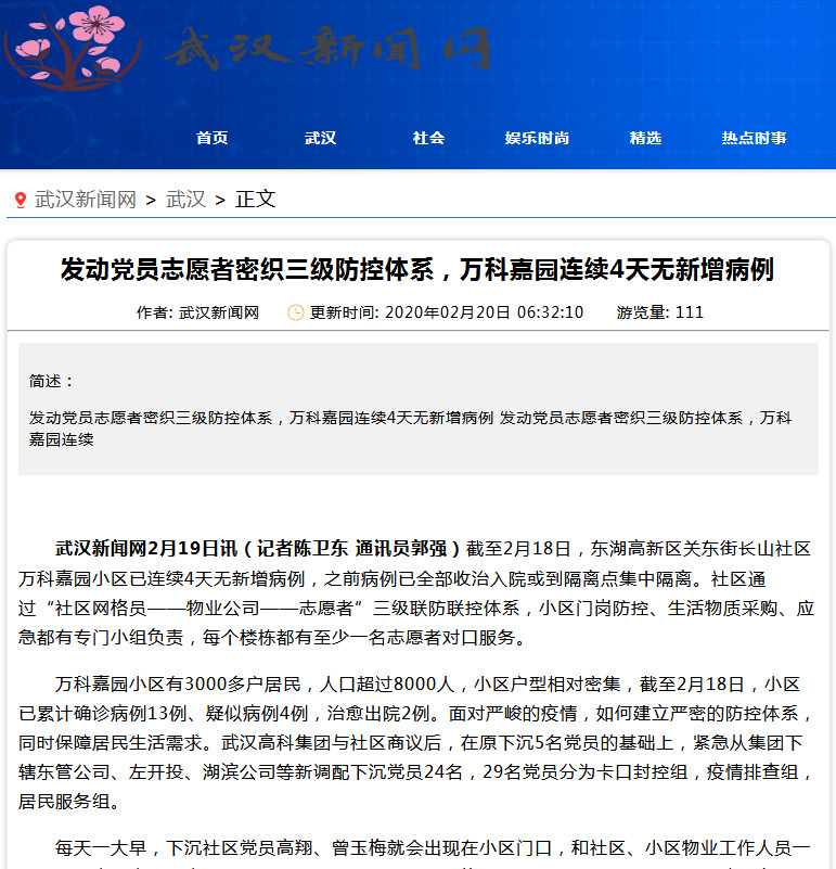 武漢新聞網(wǎng)2月19日訊(記者陳衛(wèi)東?通訊員郭強(qiáng))截至2月18日,東湖高新區(qū)關(guān)東街長山社區(qū)萬科嘉園小區(qū)已連續(xù)4天無新增病例,之前病例已全部收治入院或到隔離點集中隔離。社區(qū)通過“社區(qū)網(wǎng)格員——物業(yè)公司——志愿者”三級聯(lián)防聯(lián)控體系,小區(qū)門崗防控、生活物質(zhì)采購、應(yīng)急都有專門小組負(fù)責(zé),每個樓棟都有至少一名志愿者對口服務(wù)。