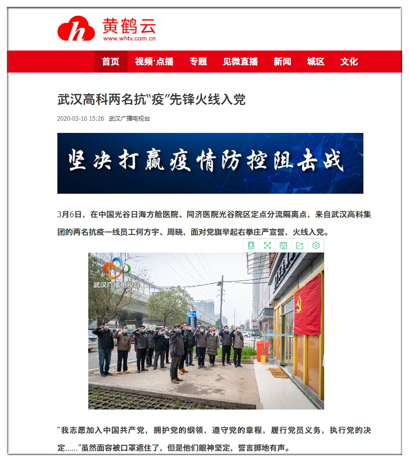 新冠肺炎疫情防控戰(zhàn)打響后,武漢高科集團(tuán)廣大黨員干部職工迅速響應(yīng),全員上陣、積極作為,在抗疫中叩問(wèn)初心,在火線上錘煉黨性,以實(shí)際行動(dòng)彰顯了國(guó)有企業(yè)的責(zé)任擔(dān)當(dāng)。在疫情“大考”面前,一大批非黨員干部職工也主動(dòng)請(qǐng)纓、沖鋒在前,積極向黨組織靠攏,其中何方宇、周曉等同志在抗疫一線表現(xiàn)突出,經(jīng)集團(tuán)黨委研究并報(bào)上級(jí)黨組織備案,被火線吸收為中共預(yù)備黨員。