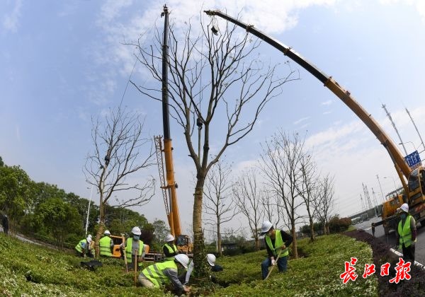 長江日報-長江網(wǎng)4月22日訊(記者陳誠 通訊員張代瑋)4月22日,光谷左嶺大道,2臺吊車、60余名園林綠化工人正在忙碌地種植喬木,對道路進(jìn)行景觀綠化提升。