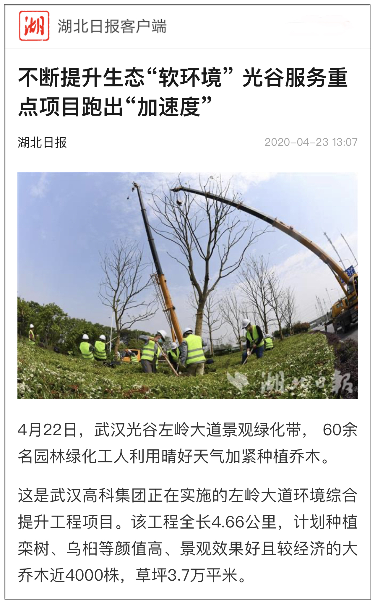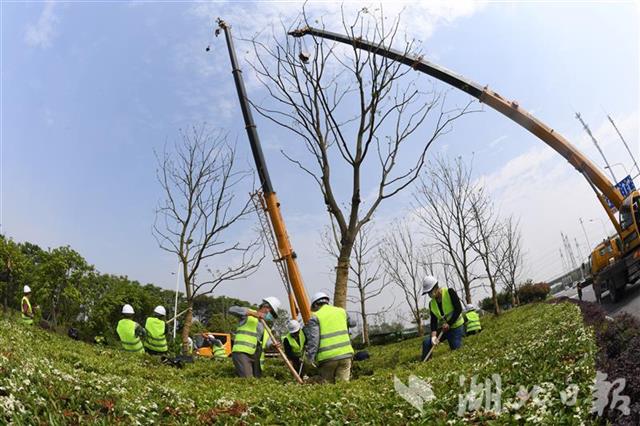 4月22日,武漢光谷左嶺大道景觀綠化帶, 60余名園林綠化工人利用晴好天氣加緊種植喬木。