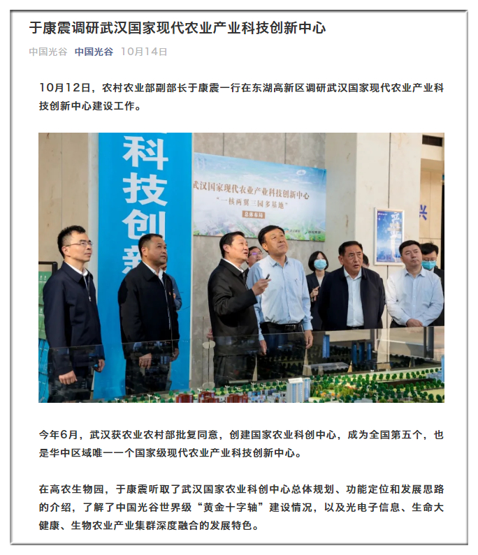 10月12日,農(nóng)村農(nóng)業(yè)部副部長于康震一行在東湖高新區(qū)調(diào)研武漢國家現(xiàn)代農(nóng)業(yè)產(chǎn)業(yè)科技創(chuàng)新中心建設(shè)工作。
