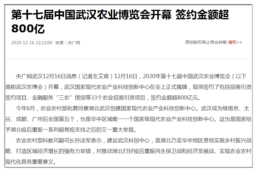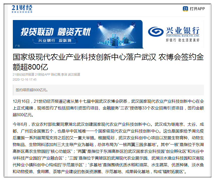 21世紀(jì)經(jīng)濟(jì):國(guó)家級(jí)現(xiàn)代農(nóng)業(yè)產(chǎn)業(yè)科技創(chuàng)新中心落戶武漢