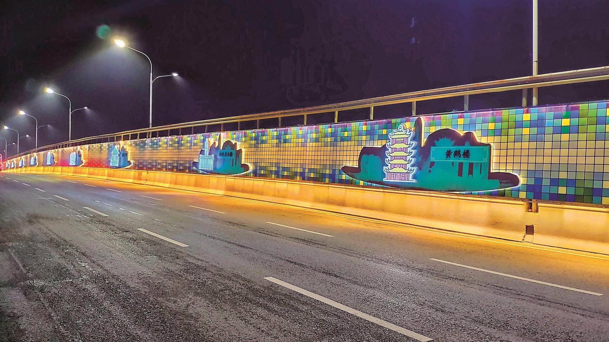 黃鶴樓、長江大橋、江漢關(guān)……昨晚,記者驅(qū)車行駛在武漢光谷左嶺大橋上,看到20個知名武漢地標被鑲在橋邊護欄上,車輛宛如穿梭在一幅絢麗的光影畫卷中。 楚天都市報極目新聞記者宋枕濤 通訊員曾晶攝