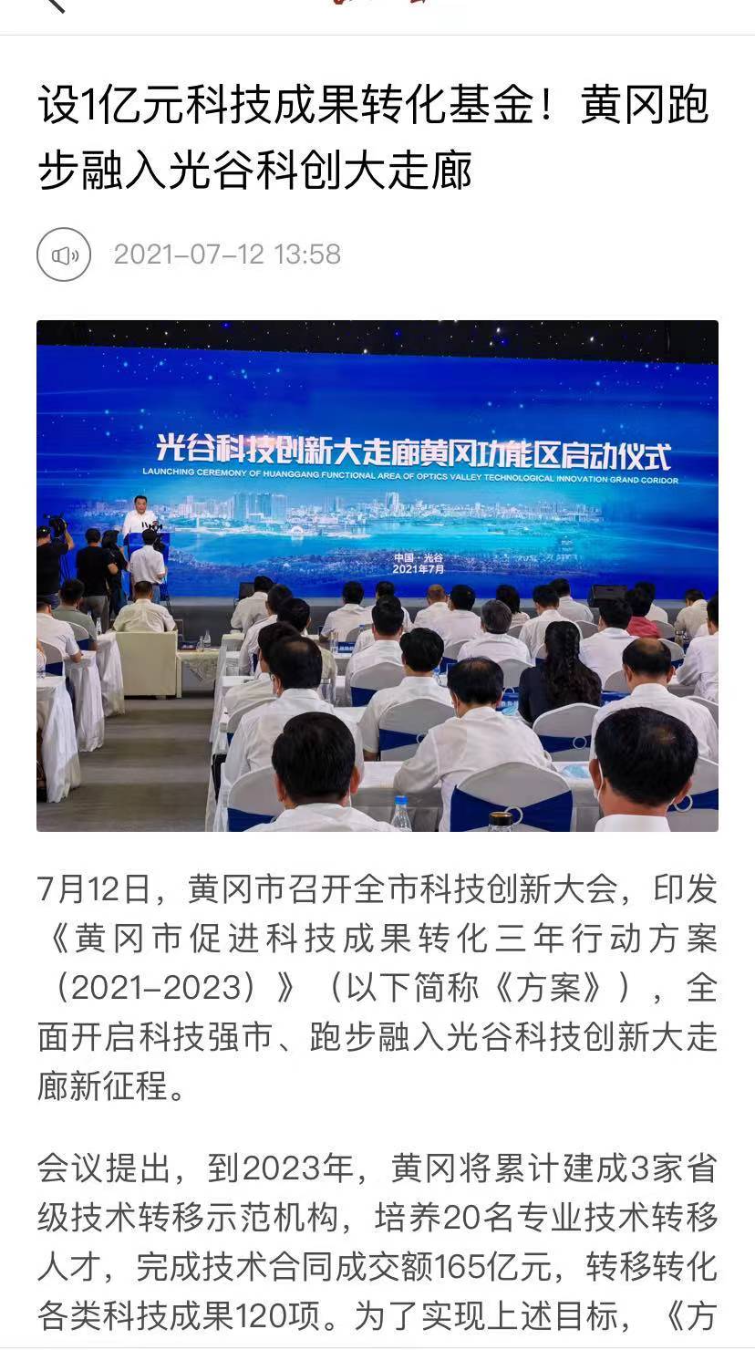 長江云客戶端:設(shè)1億元科技成果轉(zhuǎn)化基金!黃岡跑步融入光谷科創(chuàng)大走廊