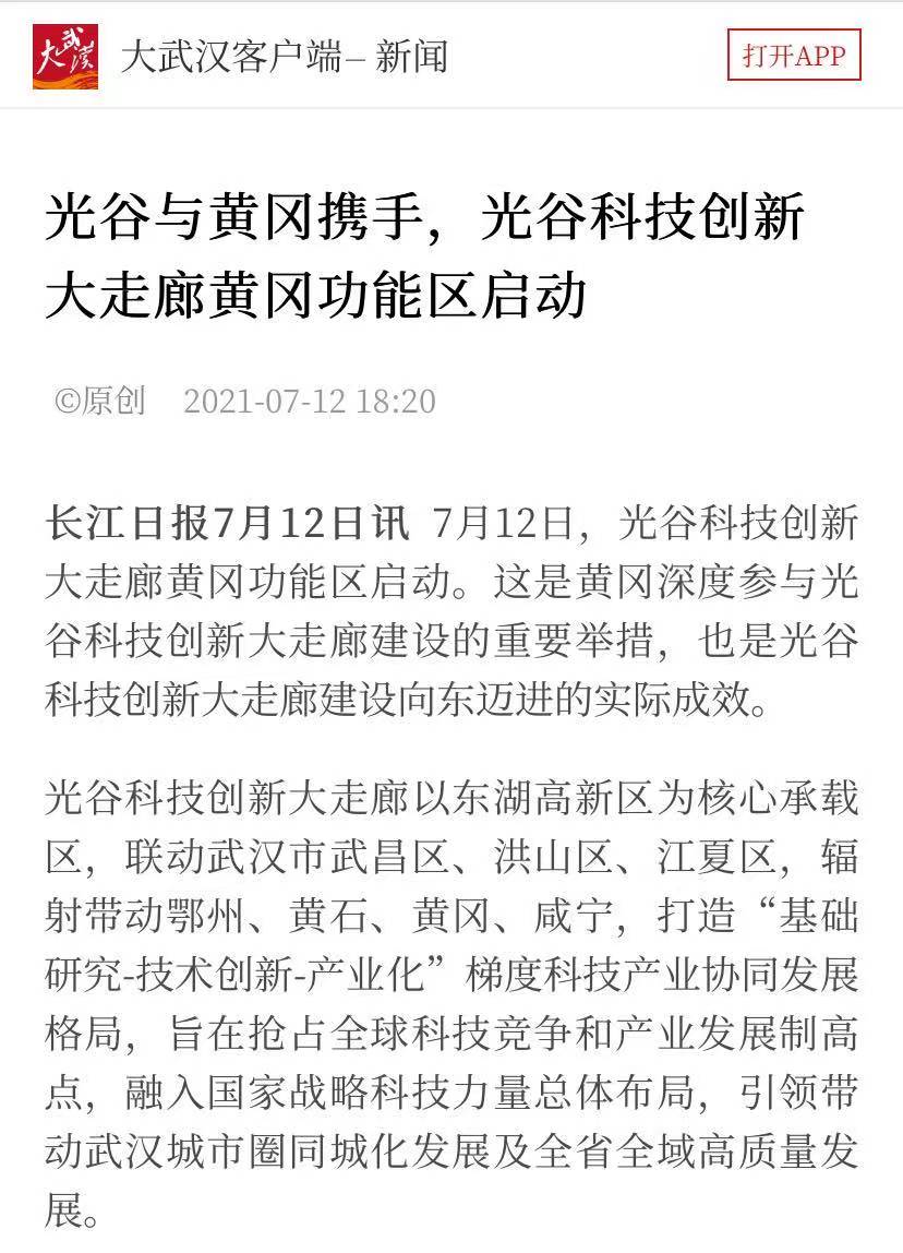 長江日報大武漢客戶端 :《光谷與黃岡攜手,光谷科技創(chuàng)新大走廊黃岡功能區(qū)啟動》