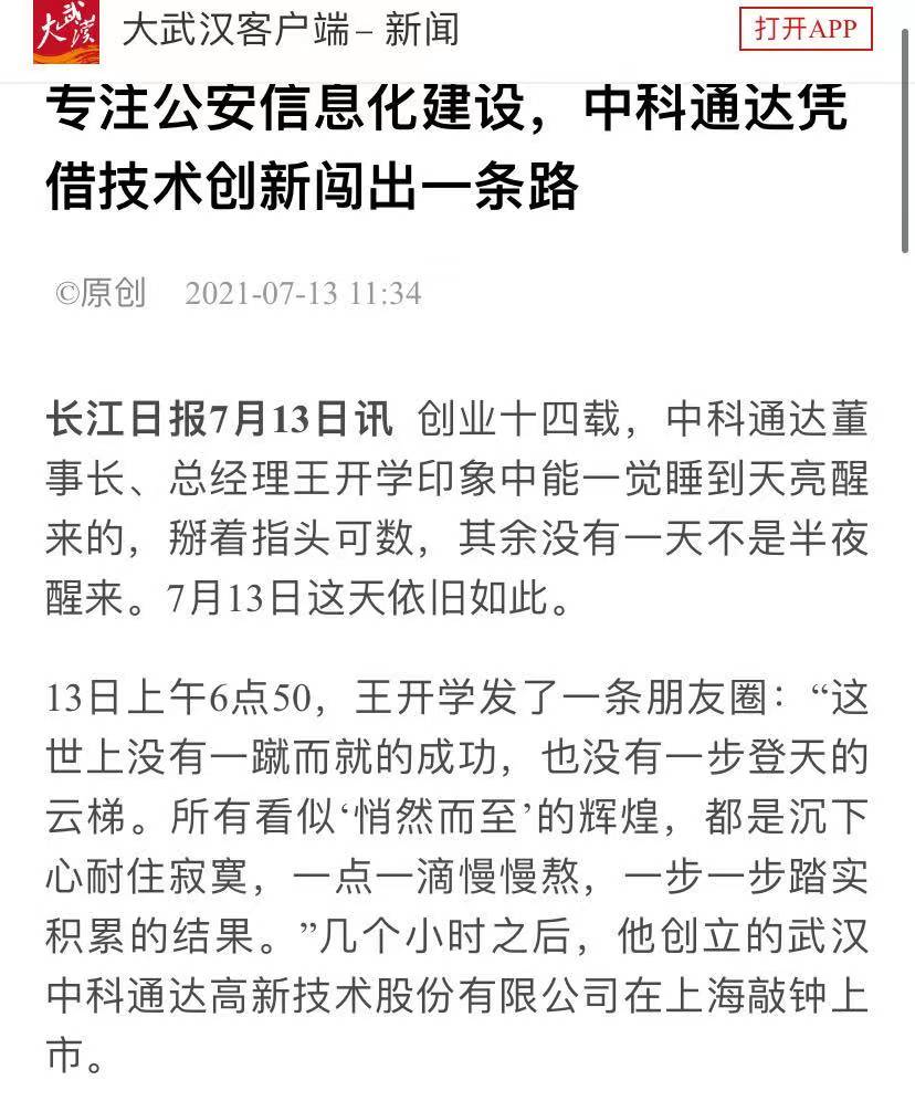 13日上午6點(diǎn)50,王開學(xué)發(fā)了一條朋友圈:“這世上沒有一蹴而就的成功,也沒有一步登天的云梯。所有看似‘悄然而至’的輝煌,都是沉下心耐住寂寞,一點(diǎn)一滴慢慢熬,一步一步踏實(shí)積累的結(jié)果?!睅讉€(gè)小時(shí)之后,他創(chuàng)立的武漢中科通達(dá)高新技術(shù)股份有限公司在上海敲鐘上市。
