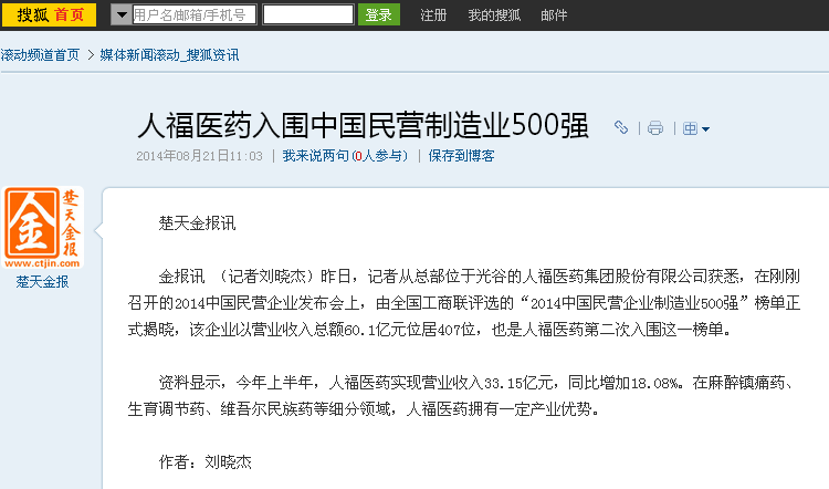 金報訊 (記者劉曉杰)昨日,記者從總部位于光谷的人福醫(yī)藥集團(tuán)股份有限公司獲悉,在剛剛召開的2014中國民營企業(yè)發(fā)布會上,由全國工商聯(lián)評選的“2014中國民營企業(yè)制造業(yè)500強(qiáng)”榜單正式揭曉,該企業(yè)以營業(yè)收入總額60.1億元位居407位,也是人福醫(yī)藥第二次入圍這一榜單。