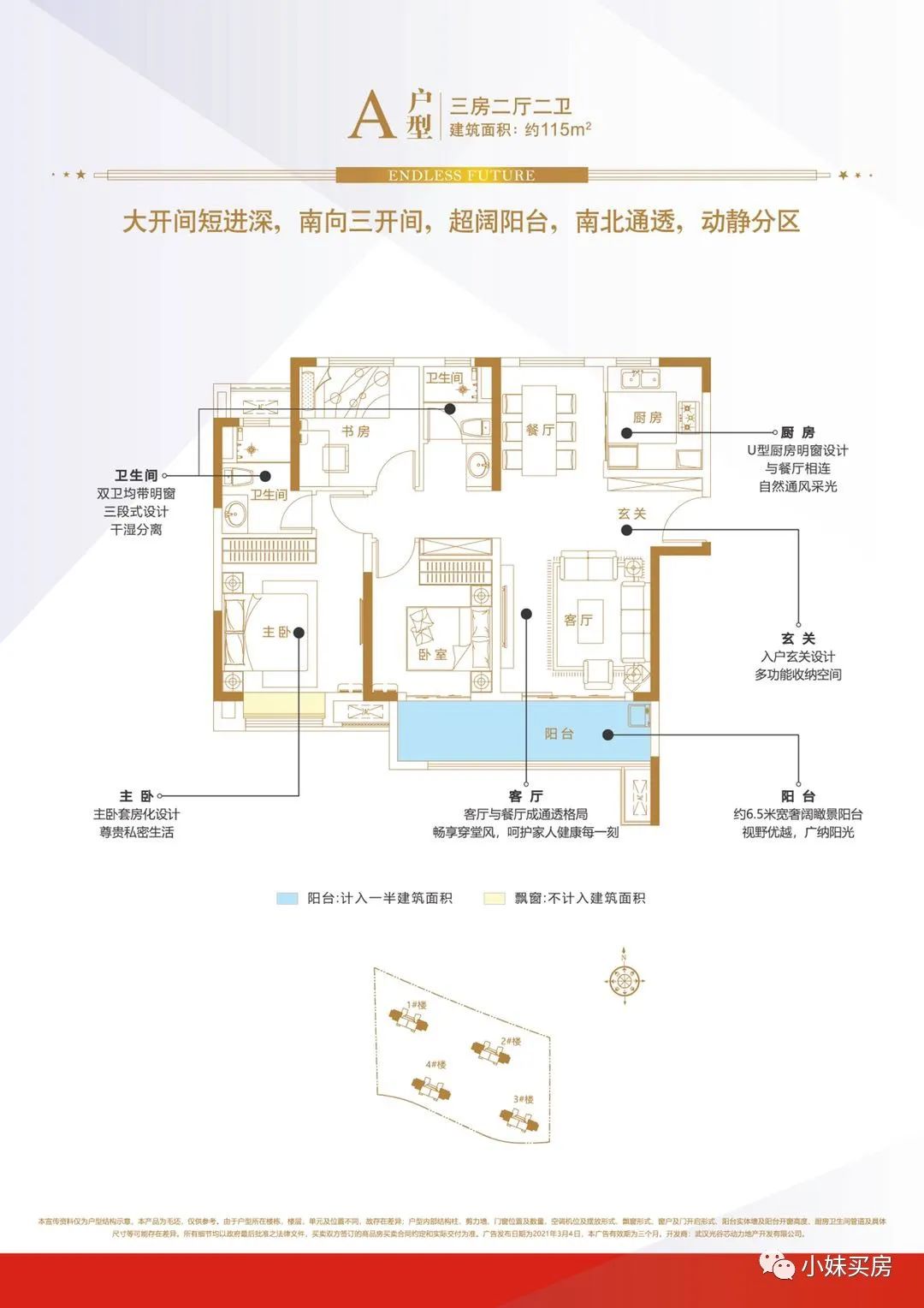 ? ? ? 建面約115平戶型:主臥套間設(shè)計(jì),而且一線貫穿,空間比較闊綽,主臥套房設(shè)計(jì),帶獨(dú)立衛(wèi)生間,私密性更好??蛷d與南向次臥連接一個(gè)約6.5米景觀大陽臺(tái),觀景、晾曬、采光都比較不錯(cuò),可滿足三代同堂居住需求!